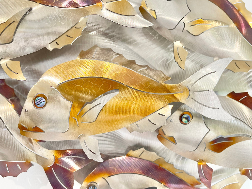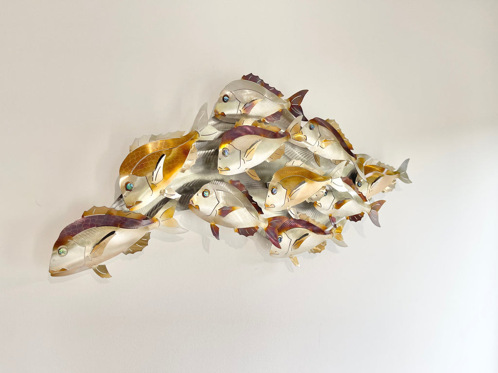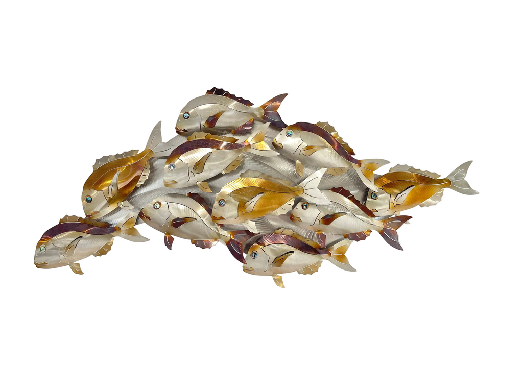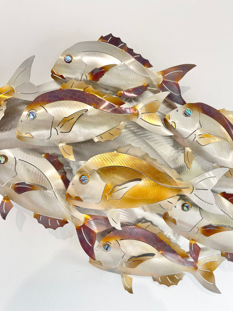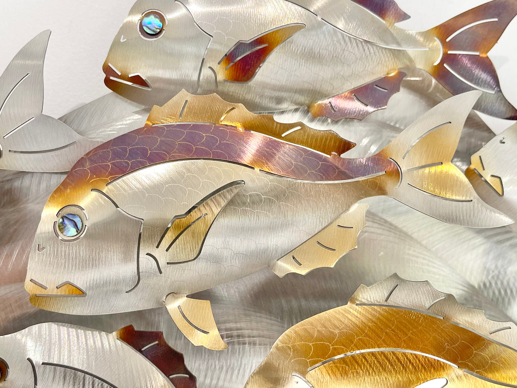 Creating each fish involves a meticulous 15-step process, beginning with the use of premium 316 marine-grade stainless steel. Once the design is finalized, it is precisely cut with a laser cutter, followed by thorough cleaning of the front, back, and edges. Without revealing all our secrets, further steps include colouring, shaping and forming, placing the Paua/abalone shell eye, applying a clear coat spray, and assembling. This meticulous attention to detail ensures every piece is uniquely handcrafted meaning no two pieces are ever quite the same! Easy to install with a chain on the back and hung with a single screw. Easy to change the angle/direction of the school once mounted on your wall. Comes in its own box with mounting screw included along with Jiwa steel information for your convenience.